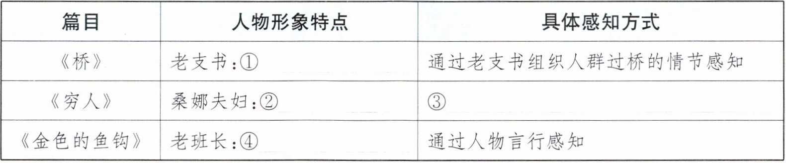 | 《桥》 | 老支书:① | 通过老支书组织人群过桥的情节感知 |