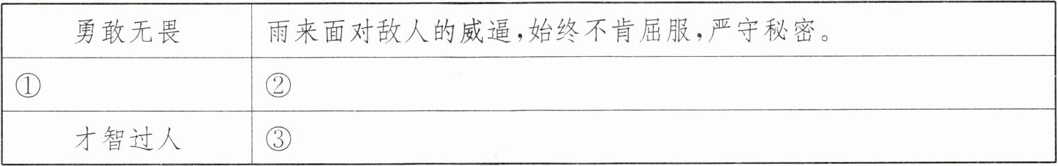 | 勇敢无畏 | 雨来面对敌人的威逼,始终不肯屈服,严守秘密。 |