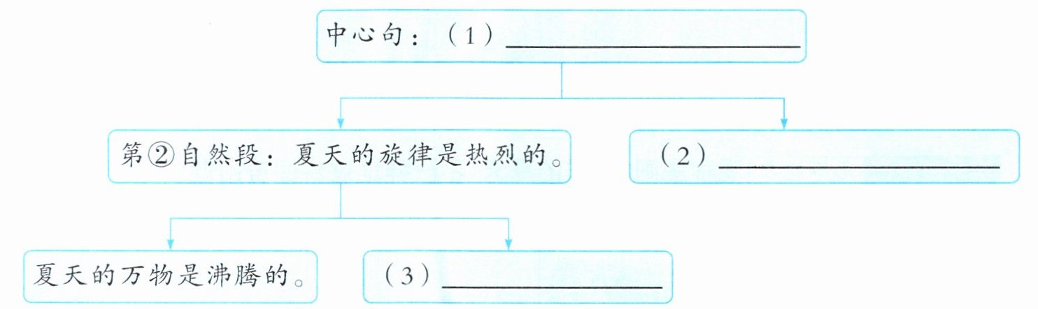 3.(1)充满整个夏天的是一种紧张、热烈、急促的旋律。 (2)第③自然段:夏天的旋律是紧张的。 (3)夏天的色彩是金黄的。