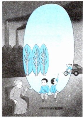 示例:整个画面分成内外框两部分。左下角,一位老人坐在椅子上,外面满是工厂的大烟囱,正向空气中释放着滚滚黑烟,外框的世界也被这浓烟染成了灰色。老人想起当年的世界——画面中间那个蓝天白云、青草绿树的世界,孩童们在那个充满希望的世界里畅想着未来。含义:呼吁人们重视生态环境的保护,不能让绿意消失在地球上。【解析】可以从“保护生态环境”“绿化美化家园”等方面来回答。