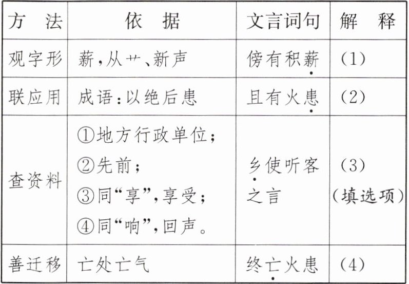 •|(2)||查资料|①地方行政单位;②先前;③同“享”,享受;④同“响”,回声。|乡•使听客之言|(3)(填选项)|