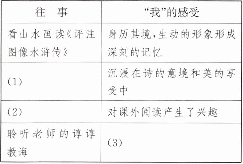 [解析]根据第2段可知,作者小时候看山水画会入神,看《评注图像水浒传》插图时仿佛亲眼看到书中场景,犹如身临其境,这种生动的感受让作者后来明白了形象思维对形成深刻记忆的作用。由此可知,读书要发挥想象力,培养形象思维,才能形成深刻的记忆。根据第4段"《千家诗》中很大一部分诗歌歌咏祖国风物,按春夏秋冬时序编排……沉浸在美的享受中,生活情趣浓浓郁郁"、第5段"国文教师教古文喜欢大声朗诵。……爱国情怀油然而生"可知,作者通过吟诵《千家诗》,感受到了四季风光的美好以及生活的绚丽多彩;通过听老师朗诵辛弃疾的词,体会到了其中的情感,激发了爱国情怀。由此可知,语文学习可以在诵读中感受文字和生活的美好。根据第6段可知,老师教导作者和同学们,不能仅局限于课本,要在课外有计划地认真读好书,这样能丰富知识、增添智慧、提升志趣,而作者也将老师的话铭记于心并受益终身。由此可知,语文学习要多读书,读好书;认认真真有计划地读书。