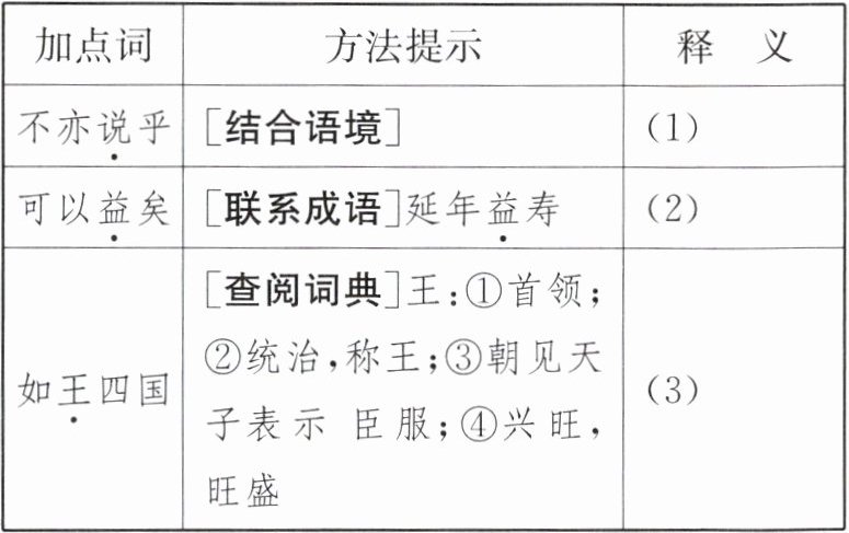 四国|[查阅词典]王:①首领;②统治,称王;③朝见天子表示臣服;④兴旺,旺盛|(3)|11. 用现代汉语翻译下列句子。