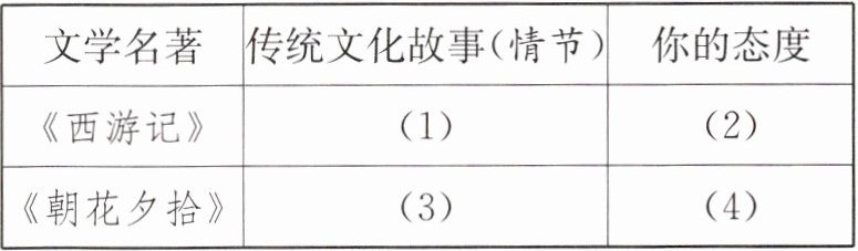 13. (2024·常州期末)中考新考法 链接名著 《典籍里的中国》是中央广播电视总台推出的一档大型文化节目。对于中国传统文化,我们应该要有正确的态度——“取其精华,去其糟粕”。《典籍里的中国》制作团队邀请你参加新一期的节目录制,请从《朝花夕拾》《西游记》中各举一个与传统文化有关的故事(情节),并说明你的态度。