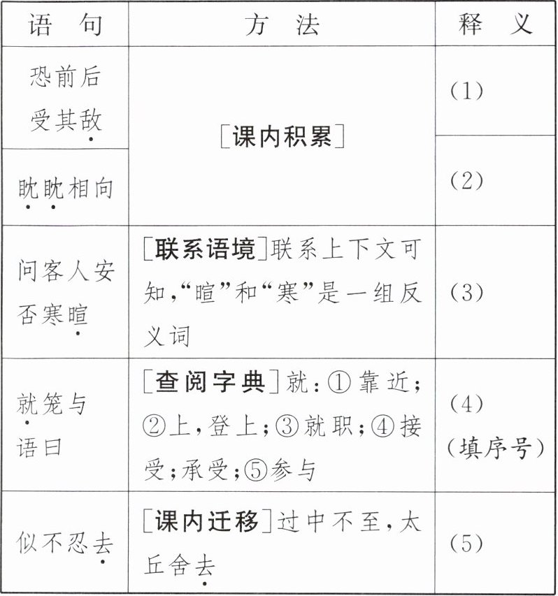 1. 小雨积累了一些学习文言字词的方法,请借助他的方法,解释材料中的词义。