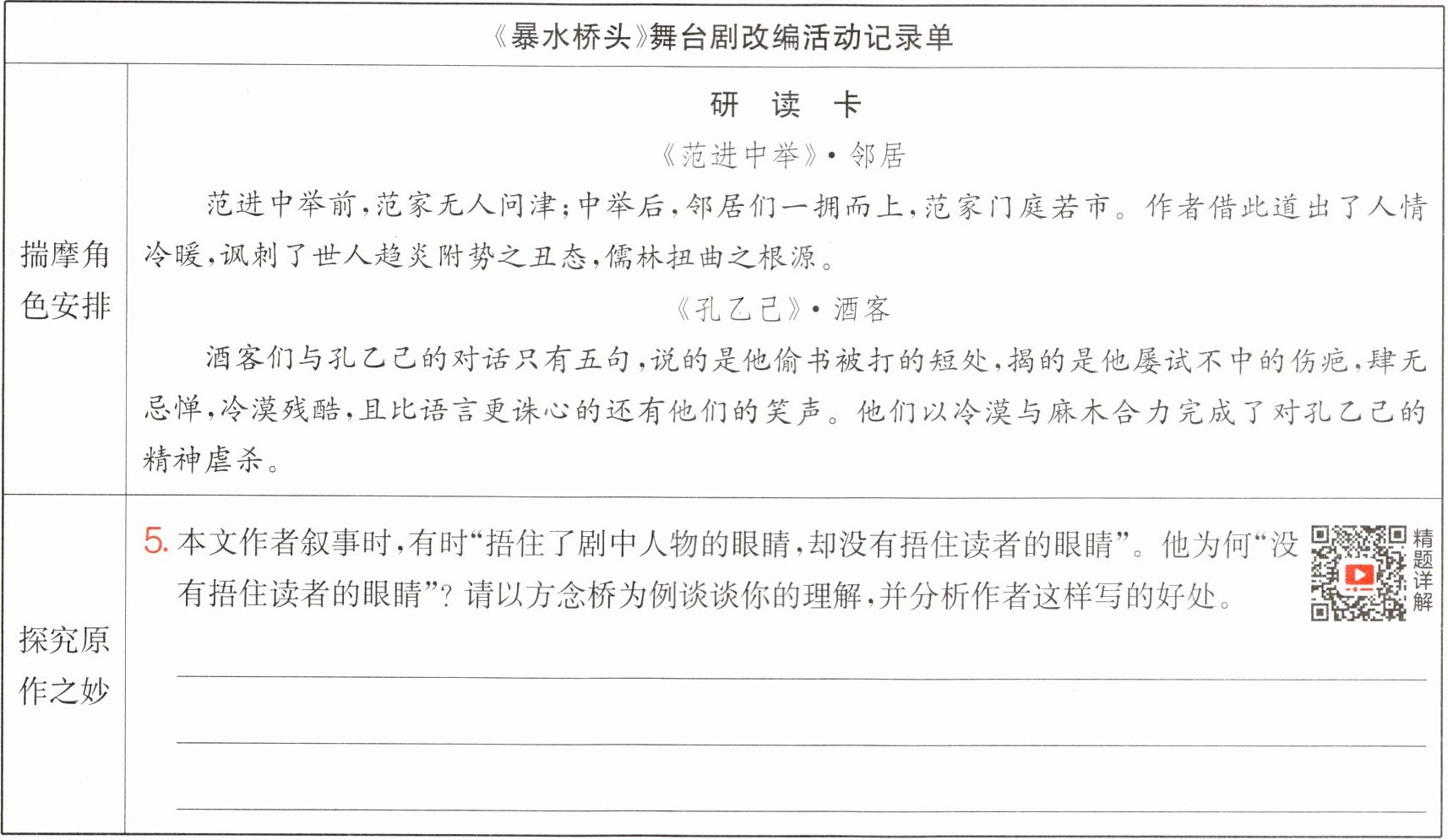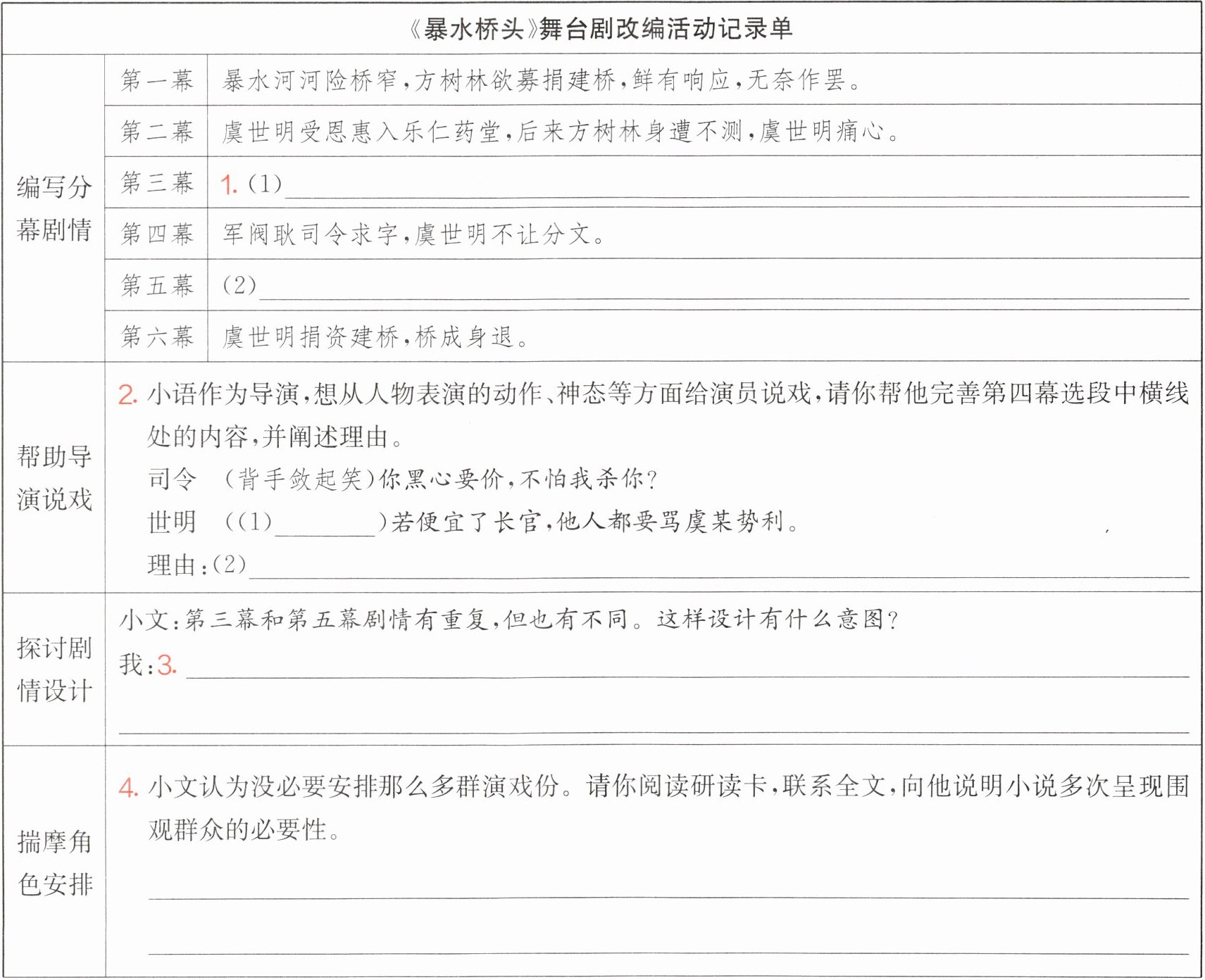 新情境 改编舞台剧 同学们想将《暴水桥头》改编为舞台剧,请你一起讨论,并完善下面的改编活动记录单。