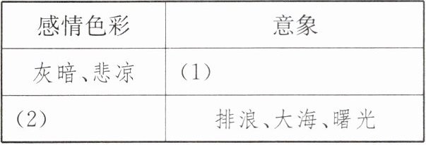 (2)根据“排浪、大海、曙光”在诗中的位置可知,这些都是诗人渴望的事物,是诗人在痛苦现实中对未来坚定不屈的信念的体现,所以应当填写与“灰暗、悲凉”感情色彩相反的词语,如光明、温暖等。