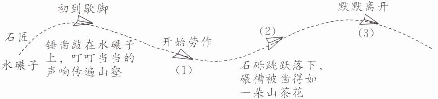 初到歇脚,锤凿敲在水碾子上,叮叮当当的声响传遍山壑。开始劳作,(1)____。石砾跳跃落下,碾槽被凿得如一朵山茶花。默默离开,(3)____。