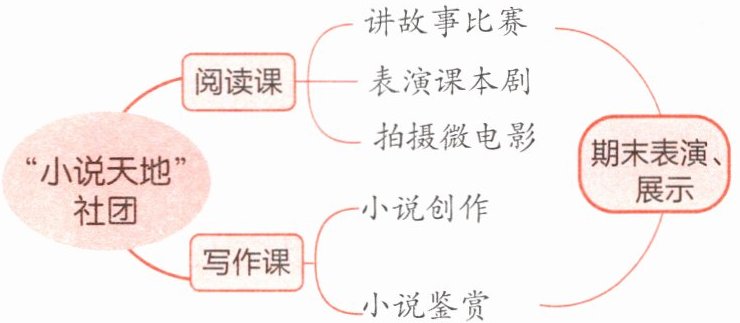 1.[示例]"小说天地"社团主要进行阅读课和写作课两项活动,阅读课会举办讲故事比赛、表演课本剧和拍摄微电影,写作课则进行小说鉴赏和小说创作,学期末将对课程进行表演、展示。
