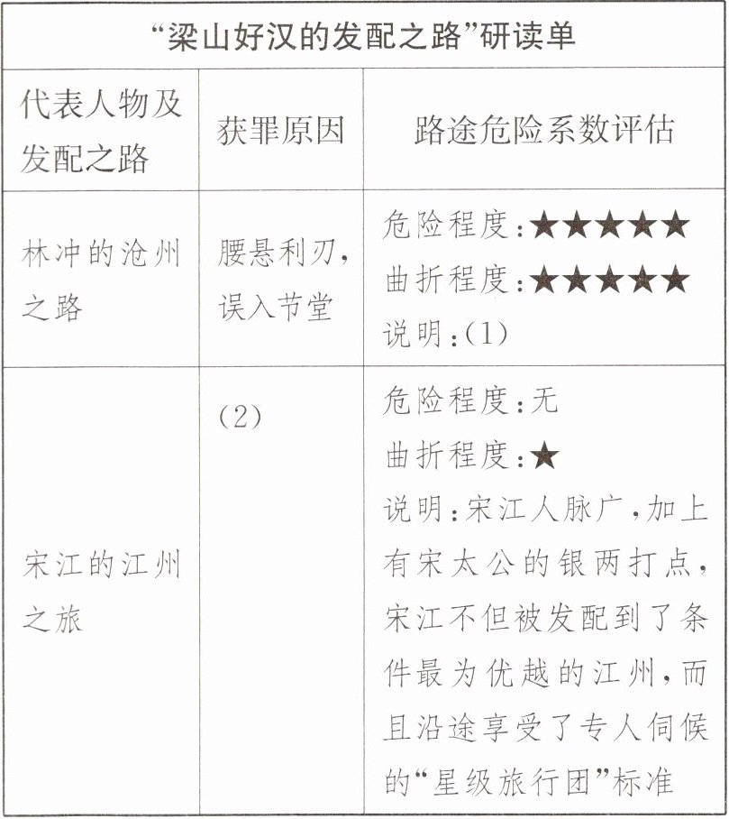 (2)根据题干信息可知,此空应概括宋江获罪的原因。宋江原为一小吏,为人仗义,好结交朋友。因黄泥冈劫生辰纲事发,宋江把官军追捕的消息告知晁盖,晁盖等上梁山后,遣刘唐送来书信及黄金酬谢,不料,其妾阎婆惜偷看了晁盖致谢的书信并扣下了黄金,宋江于当晚多次向阎婆惜索要未果后,便将其杀死,最后被发配江州。故应填“怒杀阎婆惜”。