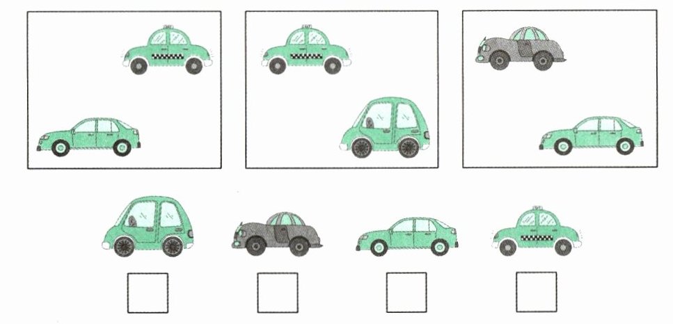 下面是明明等红灯时拍的三张照片。在最前面的车下面的□里画“√”,在最后面的车下面的□里画“○”。
