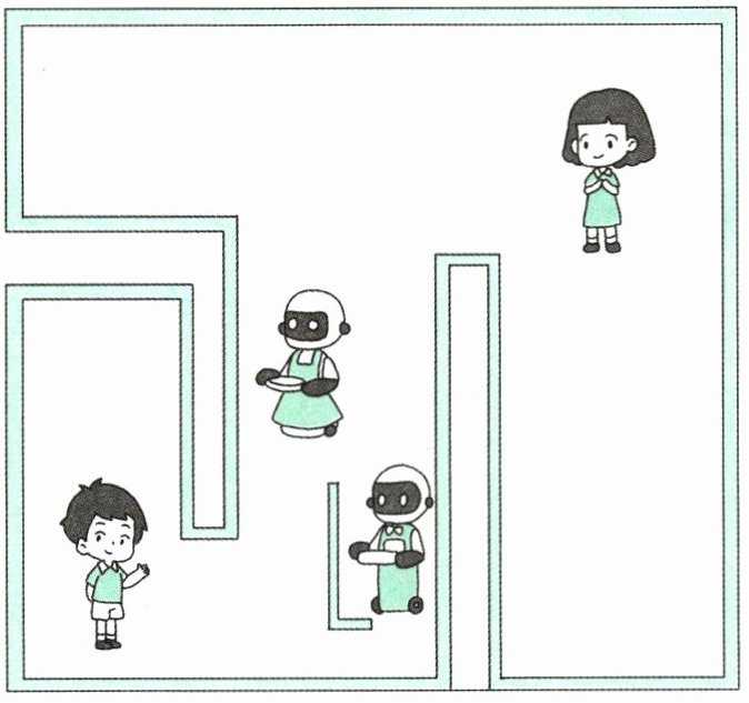 (2)下 左【提示】判断左右时,一般以观察者的左右手为参照,观察者的右手边为右边,左手边为左边。以我们自己为观察者,机器人给小女孩送餐,应先往上走,再往右走;给小男孩送餐,应先往下走,再往左走。