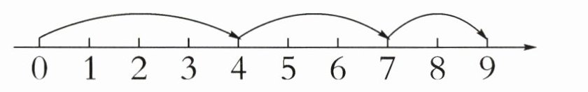 【提示】从0开始,先向后数4格,再向后数3格,再向后数2格,求一共数了几格,列式是4 + 3 + 2 = 9。