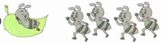1+4=5 2+1=3【提示】用叶子上原来的蚂蚁只数加上又走来的只数,即可求出蚂蚁总只数;用原来的人数加上又走来的人数,即可求出总人数。