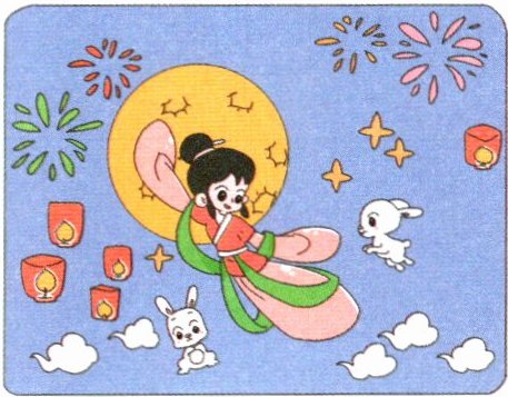 5. 嫦娥奔月啦!瞧,天上的玉兔和白云正欢迎她呢。请看图写出一个加法算式。