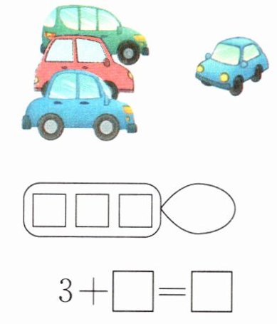 □ 3 □ 1 4【提示】左边有2只猫,右边有1只猫,合起来是2+1=3(只)猫;原来有3辆车,又开来1辆车,一共有3+1=4(辆)车。