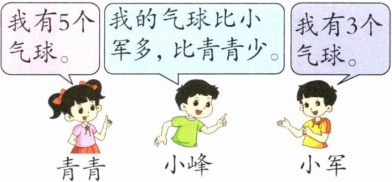 5.小峰有4个气球。 【提示】根据小朋友的对话,小峰的气球比小军多,比青青少,也就是小峰的气球数量比3个多,比5个少,所以小峰有4个气球。