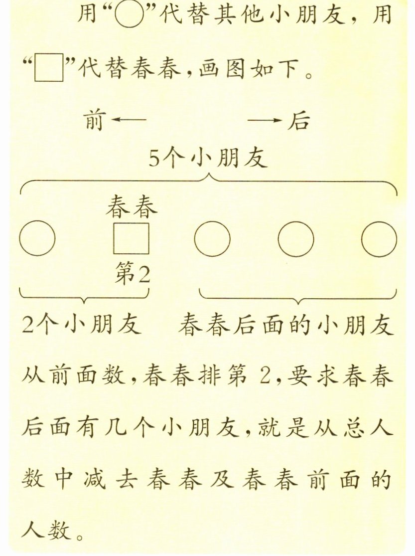 例 5个小朋友排成一队,从前面数,春春排第2,春春后面有几个小朋友?