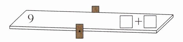 【提示】跷跷板平衡则说明两端数字的结果是相同的,找出四组结果等于9的加法算式即可。