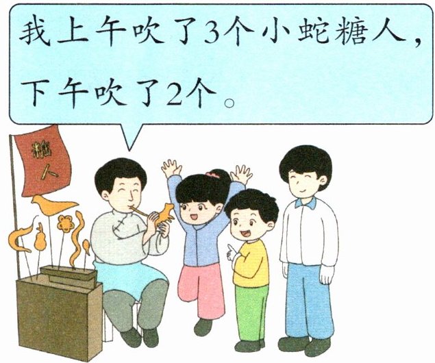 3+2=5 [提示]用上午吹的小蛇糖人个数加上下午吹的小蛇糖人个数,即可解答。