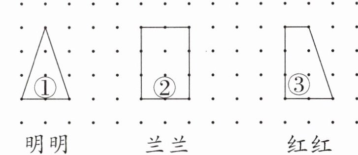 4. 跨学科 美术 美术课上,老师请小朋友们画出自己喜欢的形状,下面分别是明明、兰兰、红红3人的画。请你观察后,回答问题。(圈一圈)