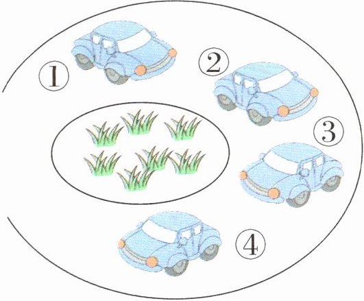 1. 第1名是( )号车;( )号车排在最后面;②号车前面一辆是( )号车,后面一辆是( )号车;①号车排第( ),它的后面有( )辆车。