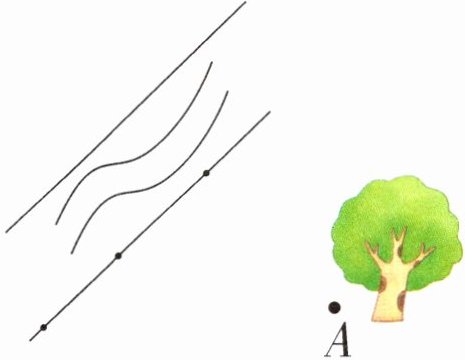 3. 李爷爷要浇树,需从点A出发到河边挑水,怎样走路程最短,图中有3个点,选择一个点画一画。