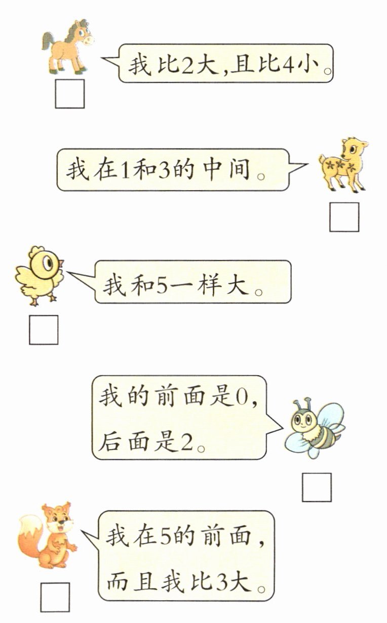 3 2 5 1 4 【提示】按数的排列顺序写一写。2后面的数比2大,4前面的数比4小,所以比2大且比4小的数是3;在1和3中间的数是2;和5一样大的数就是5本身;1的前面是0,后面是2;3后面的数比3大,又要在5的前面,所以是4。