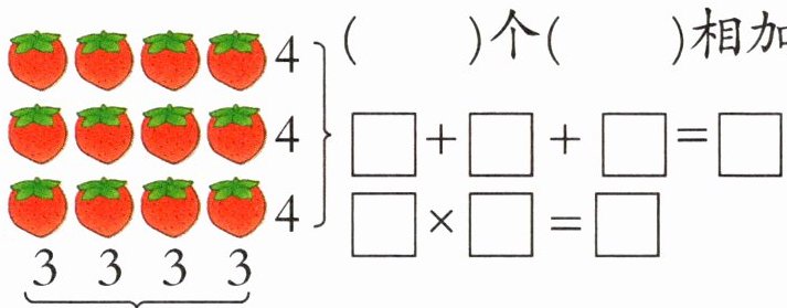 3 4 4+4+4=12 4×3=12 4 3 3+3+3+3=12 3×4=12 【提示】由图可知,有3行草莓,每行有4个。