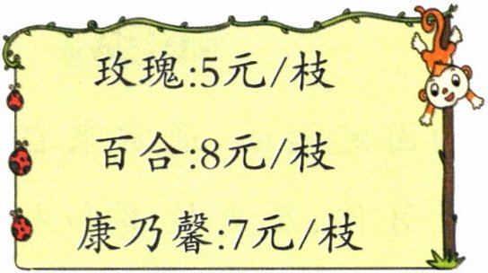 (1)5×8=40(元) [提示]求买8枝玫瑰花需要多少元,就是求8个5相加是多少,用乘法计算。