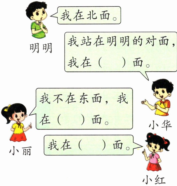南 西 东 [提示]北面的对面是南面,东面的对面是西面。