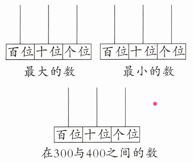[提示]最大的数:要使数最大,应将珠子尽可能多地放在最高位(百位)。因此,将6颗珠子全部放在百位上,表示的数是600。最小的数:要使数最小,应将珠子尽可能多地放在最低位(个位)。但是,由于是三位数,百位上至少要有1颗珠子。因此,将1颗珠子放在百位上,剩下的5颗珠子放在个位上,表示的数是105。在300与400之间的数:要使数在300与400之间,百位上应有3颗珠子,剩下的3颗珠子可以放在十位上,表示的数是330。