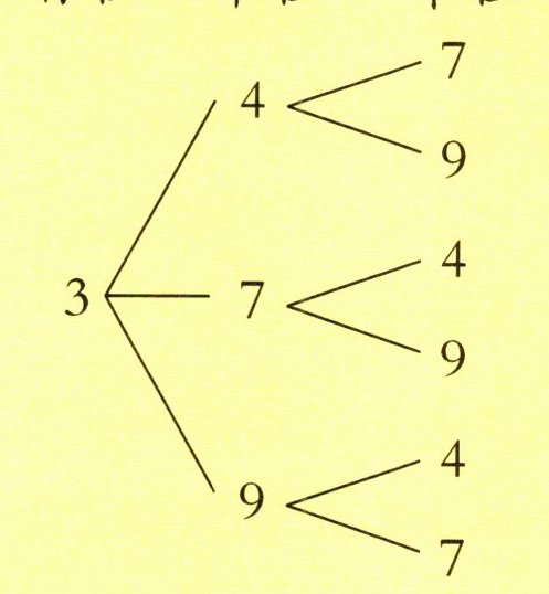 由图可知,当3放在百位上时,可以组成6个不同的三位数。同理,把4放在百位上,也可以组成6个不同的三位数;把7或9放在百位上,也均可以组成6个不同的三位数,所以一共可以组成4×6= 24(个)不同的三位数。