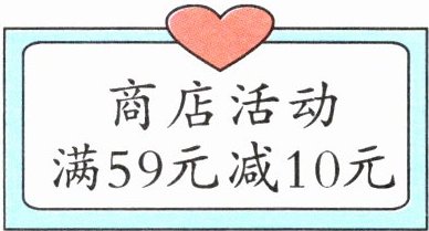 [提示]奇奇购买的水彩笔和钢笔共计18+25=43(元),优惠活动满59元减10元,因此奇奇还差59−43=16(元)就可以参加活动。