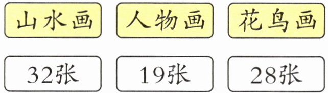 (2)答案不唯一,如:人物画比花鸟画少多少张? 28-19=9(张) 【提示】花鸟画的张数-人物画的张数=人物画比花鸟画少的张数。