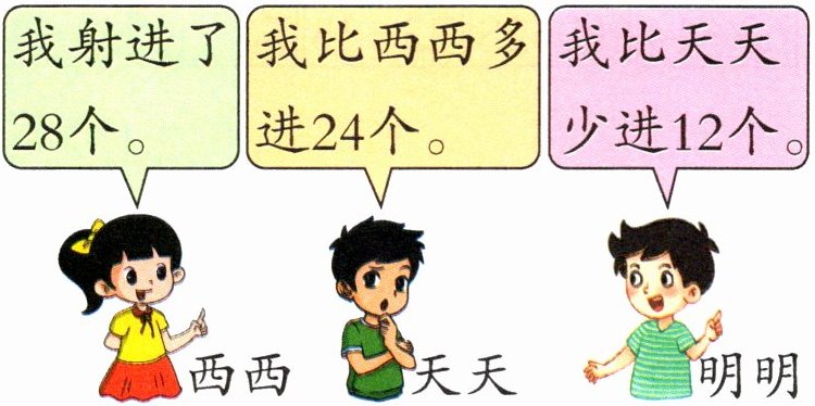 【提示】已知西西射进了28个球,天天比西西多进了24个球,则要求天天射进了多少个球,用西西射进的个数加上24即可。已知明明比天天少进12个球,则要求明明射进了多少个球,用天天射进的个数减去12即可。