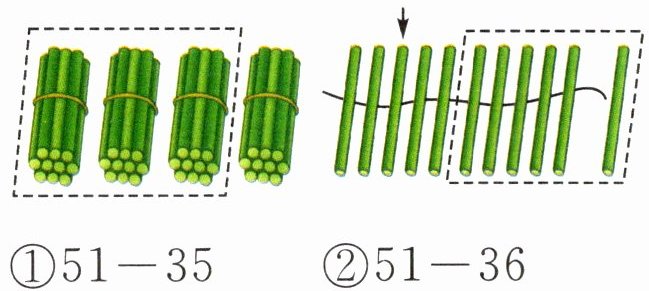 (1)② 【提示】小棒的总数是51根,分出去36根,那么剩下的小棒数量对应算式就是51-36。