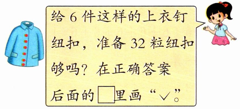 5.6×6=36(粒) 不够□√【提示】每件上衣需要6粒纽扣,6件这样的上衣需要6×6=36(粒)纽扣。与32粒比较大小,32<36,所以不够。