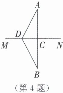 4. 如图,A,B 两个村庄在河 MN 的两侧,连结 AB,与 MN 相交于点 C,点 D 在 MN 上,连结 AD,BD,且 AD= BD.若要在河上建一座桥,使 A,B 两个村庄来往最便捷,则应该把桥建在点 C 处还是点 D 处?为什么?