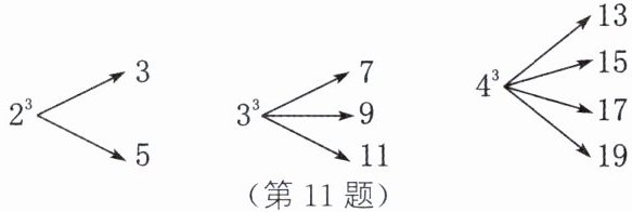 11. 一个自然数的立方可以分裂成若干个连续奇数的和,如$2^3$,$3^3和4^3$分别可以按如图所示的方式“分裂”成2个、3个和4个连续奇数的和,即$2^3$= 3+5,$3^3$= 7+9+11,$4^3$= 13+15+17+19.若$6^3$也按照此规律来进行“分裂”,则$6^3$“分裂”出的奇数中,最大的奇数是多少?