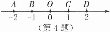 4. 如图,数轴上的点A,B,O,C,D分别表示数-2,-1,0,1,2,则表示数$2-\sqrt{5}$的点P应落在 (