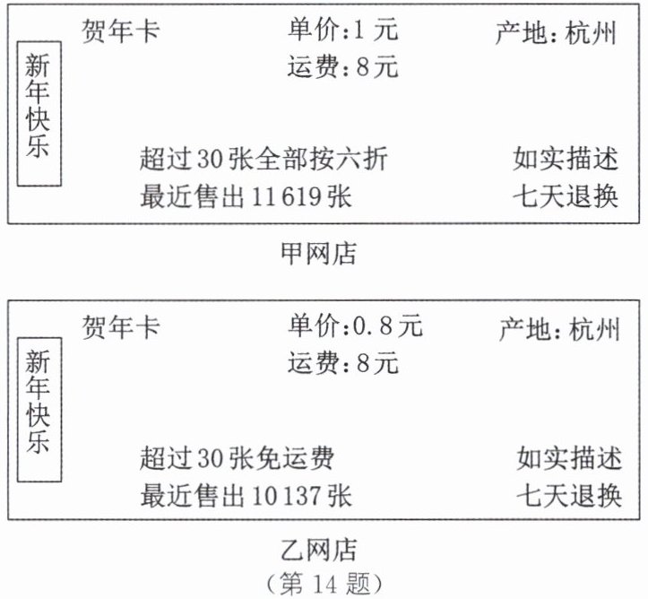 14. 新情境·日常生活 某精品书店想购买一种贺年卡在元旦时销售,在互联网上搜索了甲、乙两家网店(如图),已知甲、乙两家网店的这种贺年卡的质量相同.