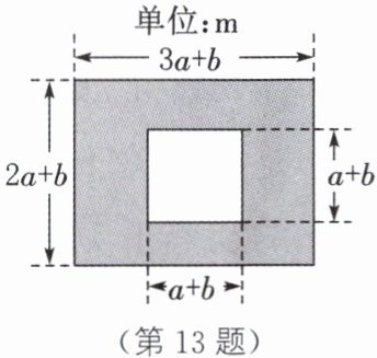 13. 如图,某市有一块长为$(3a+b)$m、宽为$(2a+b)$m的长方形空地,某部门计划将部分区域(涂色部分)进行绿化,并在中间边长为$(a+b)$m的正方形空地上修建一座雕像.