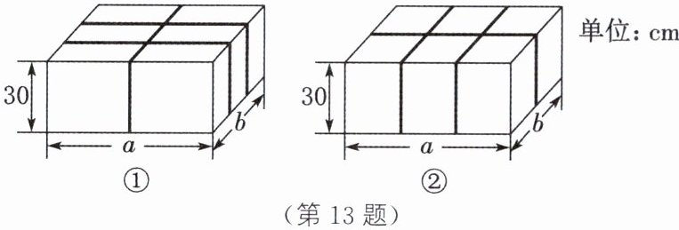 13. 新情境·日常生活 火车站、机场等场所都有为旅客提供打包服务的项目.现有一个长、宽、高分别为 a cm,b cm,30 cm 的箱子(其中 a > b),准备采用如图①②所示的两种打包方式,所用打包带的总长(不计接头处的长)分别记为$l_{1},l_{2}.$