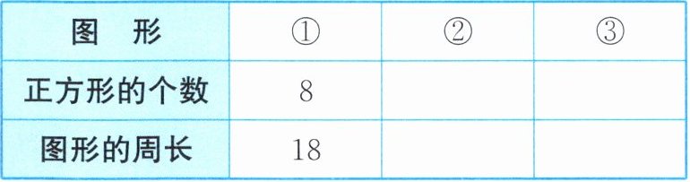 (2)当$n=1$时,正方形的个数是8,$8=5×1+3$,周长是18,$18=10×1+8;$当$n=2$时,正方形的个数是13,$13=5×2+3$,周长是28,$28=10×2+8;$当$n=3$时,正方形的个数是18,$18=5×3+3$,周长是38,$38=10×3+8.$所以图形ⓝ中,正方形的个数是$5n+3$,周长是$10n+8.$