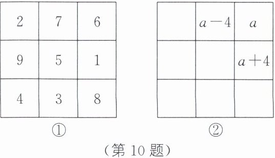 10. 新考向·数学文化 幻方是我国古代人民智慧的结晶与吉祥的象征,发源于古代的"洛书".三阶幻方有如下规律:处于同一横行、同一竖列、同一斜对角线上的三个数的和都相等(如图①).图②的三阶幻方中的9个数的和为______(用含a的式子表示).
