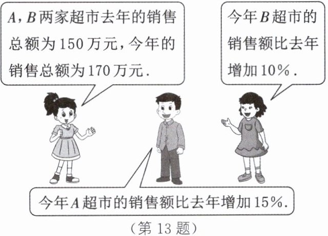13. 某综合实践活动小组去$A$,$B$两家超市调查去年和今年“五一”期间的销售情况,调查后同学们进行交流的情景如图所示. 设去年$A超市的销售额为x$万元,请根据他们的对话列出方程(不要求计算出结果).