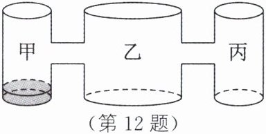 12. 如图,水平桌面上有甲、乙、丙三个圆柱形容器(容器足够高),底面半径之比为 1∶2∶1,用两根相同的管子在容器的 5 cm 高度处连通(即管子底端离容器底部的距离是 5 cm),现三个容器中,只有甲容器中有水,且水的高度为 1 cm. 若同时向乙容器和丙容器中按相同的速度注入水,开始注水 1 min,乙容器中水的高度为$\frac{5}{6}$cm,则开始注入多少分钟的水后,甲容器与乙容器中水的高度差是 0.5 cm(容器壁的厚度忽略不计)?