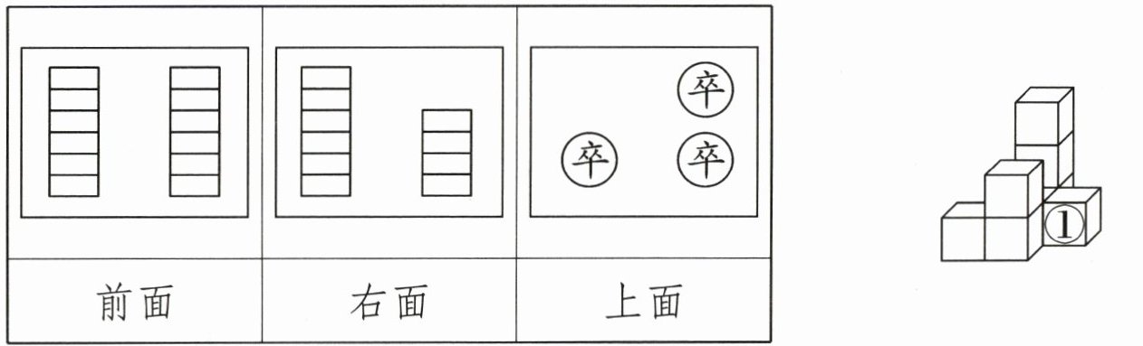 6. 用若干个小正方体摆成了右上的图形,将小正方体①拿走后,从( )面看到的图形与原来相同。