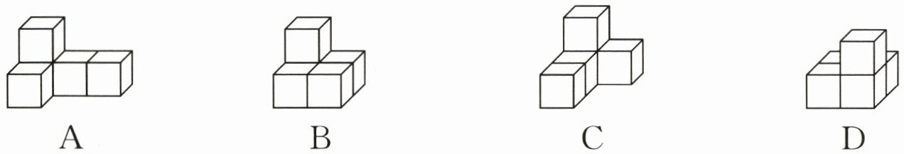 B A [提示]仔细观察,图中立体图形分2层,下面一层有3个小正方体,上面一层有1个小正方体,一共有4个小正方体,从前面看可以看到3个小正方形。